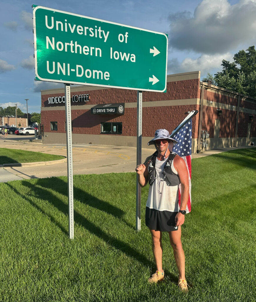 In other parts of the state, he’s known online as #Derekiscrazy—an homage to the late Ozzy Osbourne’s hit Crazy Train—for running 52 miles of the state’s famed RAGBRAI cycling event while hoisting an American flag over one shoulder to raise awareness and funds for the Veterans Flagpole Initiative, which installs flagpoles in the yards of veterans at no cost.