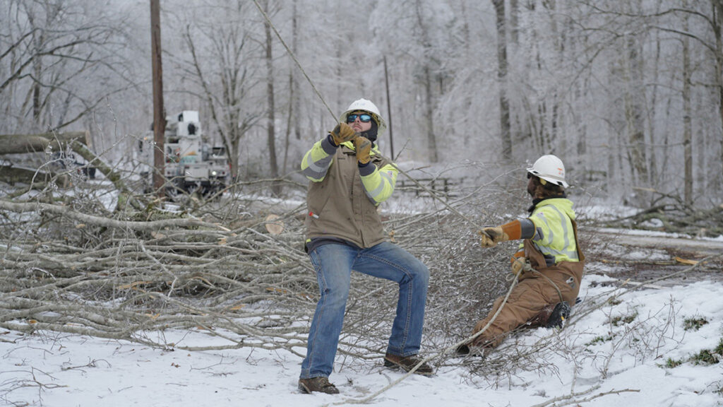 South Kentucky RECC linemen work in treacherous conditions to restore outages caused by ice and downed limbs. (Photo Courtesy: South Kentucky RECC)